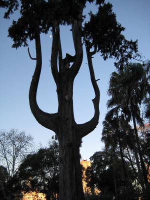 El contraste entre El Olivar y El Lezama se hizo, entonces, urgente. El Lezama es majestuoso, y solemne hasta las lágrimas, lleno de monumentos-en especial estatuas- y de hombres melancólicos, ya sea por su inevitable ancianidad o por una suerte de estar en el mundo sin tener la fuerza de otorgarle un sentido. Reposa sobre una colina y tiene árboles de especie diversa. Los hay largos, angostos y apocados (esto me hizo pensar en la descripción que hace Alejandra de Martín) y retorcidos, gruesos y magnánimos (lo cual me trajo a la mente a Alejandra); los hay en forma de instrumentos, como uno que da la impresión de esbozar la figura de una lira.